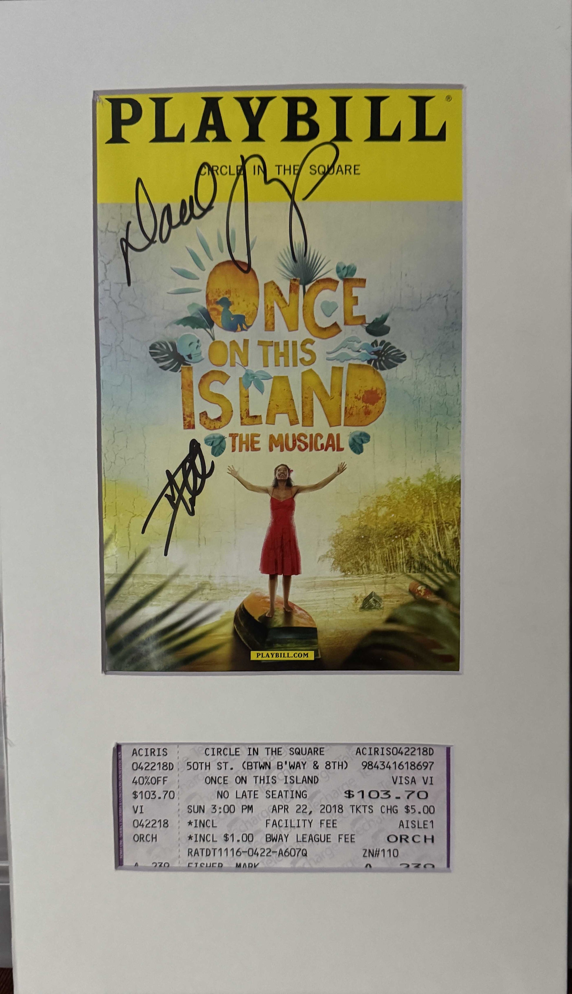 Signed Playbill matted with theatre ticket