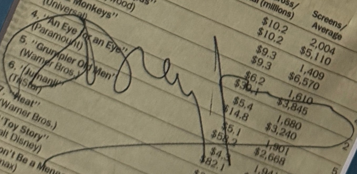 Signed in-person at Hugos in West Hollywood on January 23, 1996. I was sitting in the restaurant reading the LA Times over breakfast and read the weekend box office for Mr Holland's opening week. As I was leaving, I walked by Richard Dreyfuss, who was sitting alone a few tables away, and I congratulated him on his opening. He hadn't seen the numbers yet and asked to see the paper. After he read the box office chart and returned the paper to me, I asked him to sign it, which he graciously did.